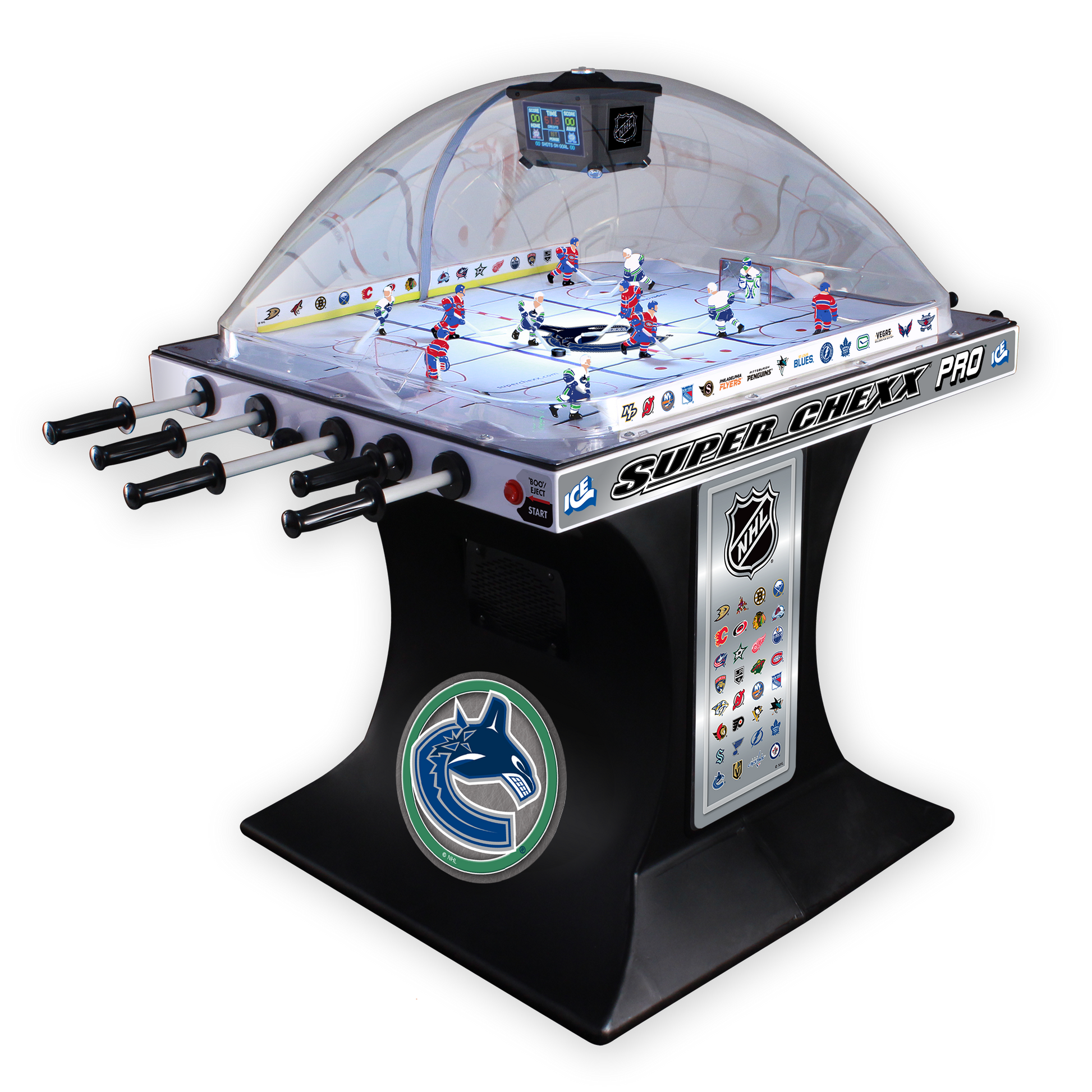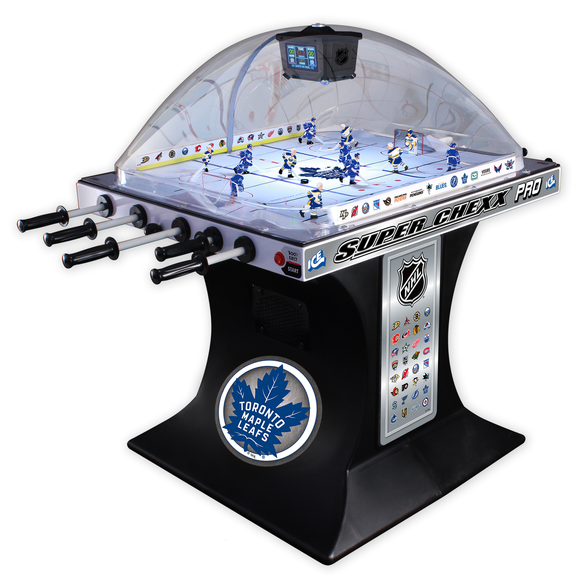 Bring the spirit of the arena home with the NHL Super Chexx Pro. Featuring official team logos, colors, and player graphics, this fast-paced bubble hockey game lets fans recreate the thrill of hockey right in their own space.